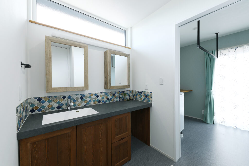 「洗う・干す・しまう」が一ヶ所で完結できる心地よい家事スペースです。広さに余裕があるので、花粉や雨の日でも安心して室内干しができます。また、洗濯物同士が重ならないぶん、乾きやすさも感じられます。リネン類の収納もたっぷり確保でき、まとめて整理できるため、入浴前の支度や片付けが自然とスムーズに。ゆったりとした間取りだからこそ、湿気がこもらず快適さを保ちやすくなっています。忙しい暮らしをやさしく支えてくれる、頼もしい空間です。