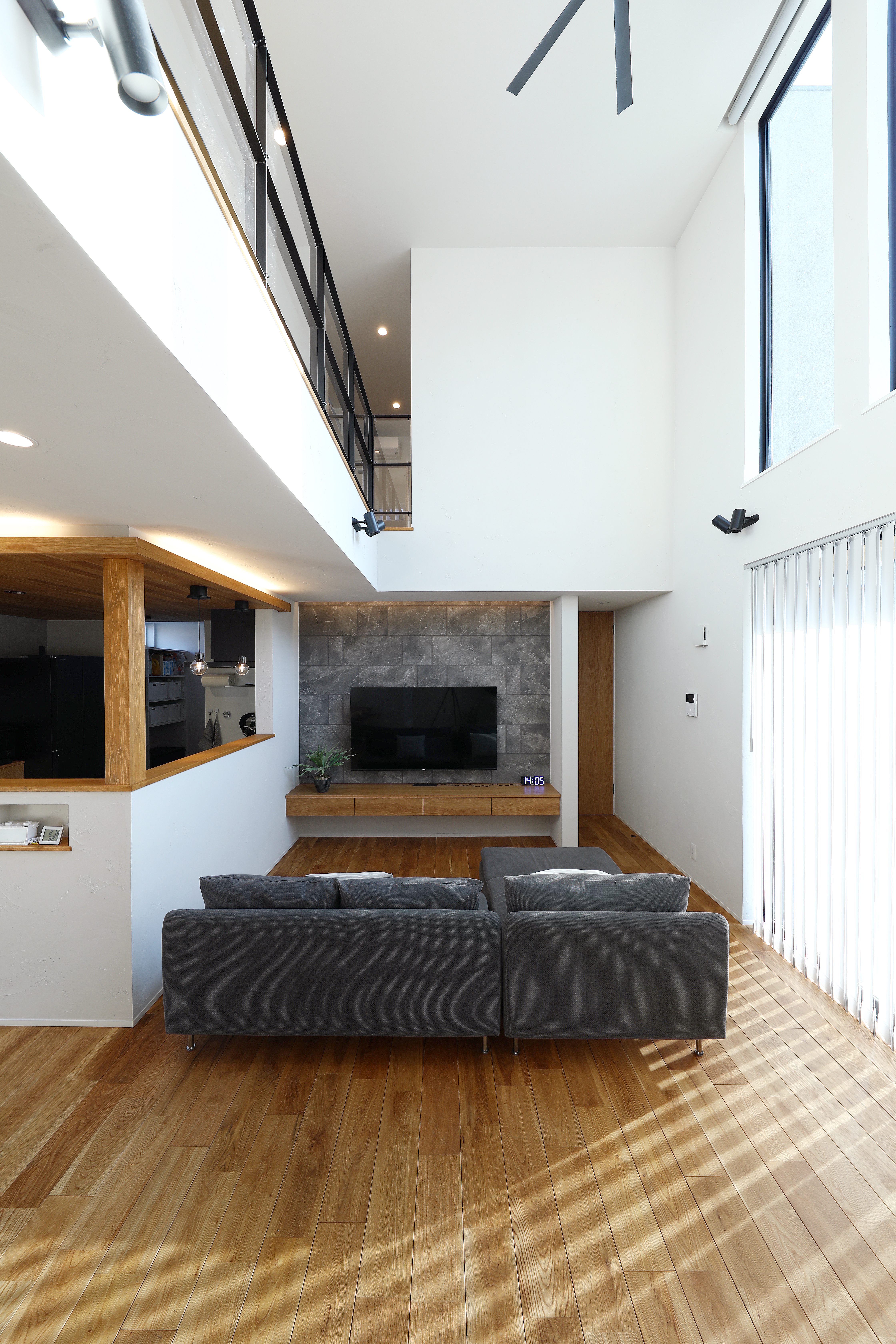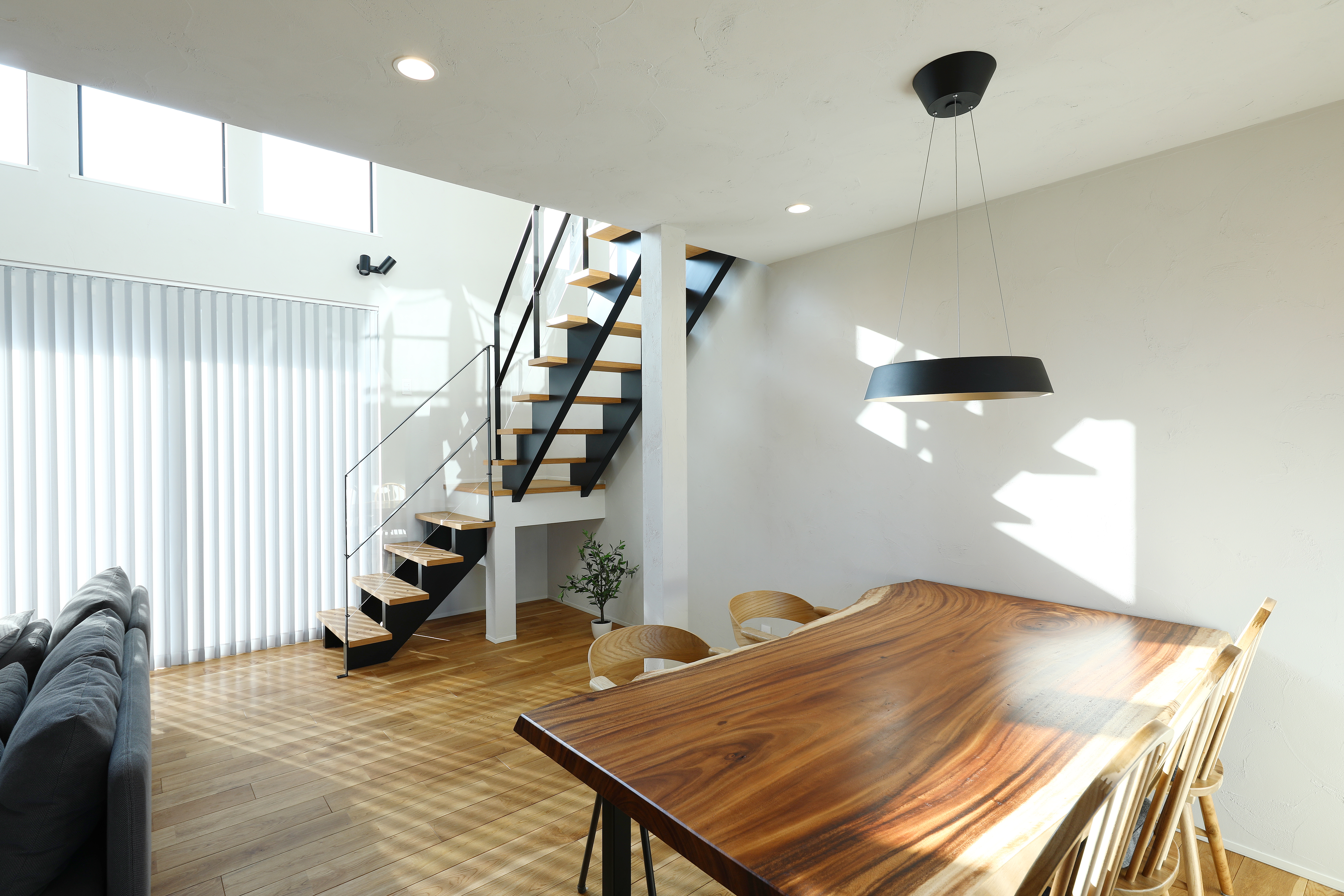 吹抜けと大開口サッシが生み出す圧倒的な明るさ。天井高を活かしたゆとりある設計により、存在感のある家具や大きな観葉植物、アートやポスターといったボリュームのあるインテリアも自然に調和します。