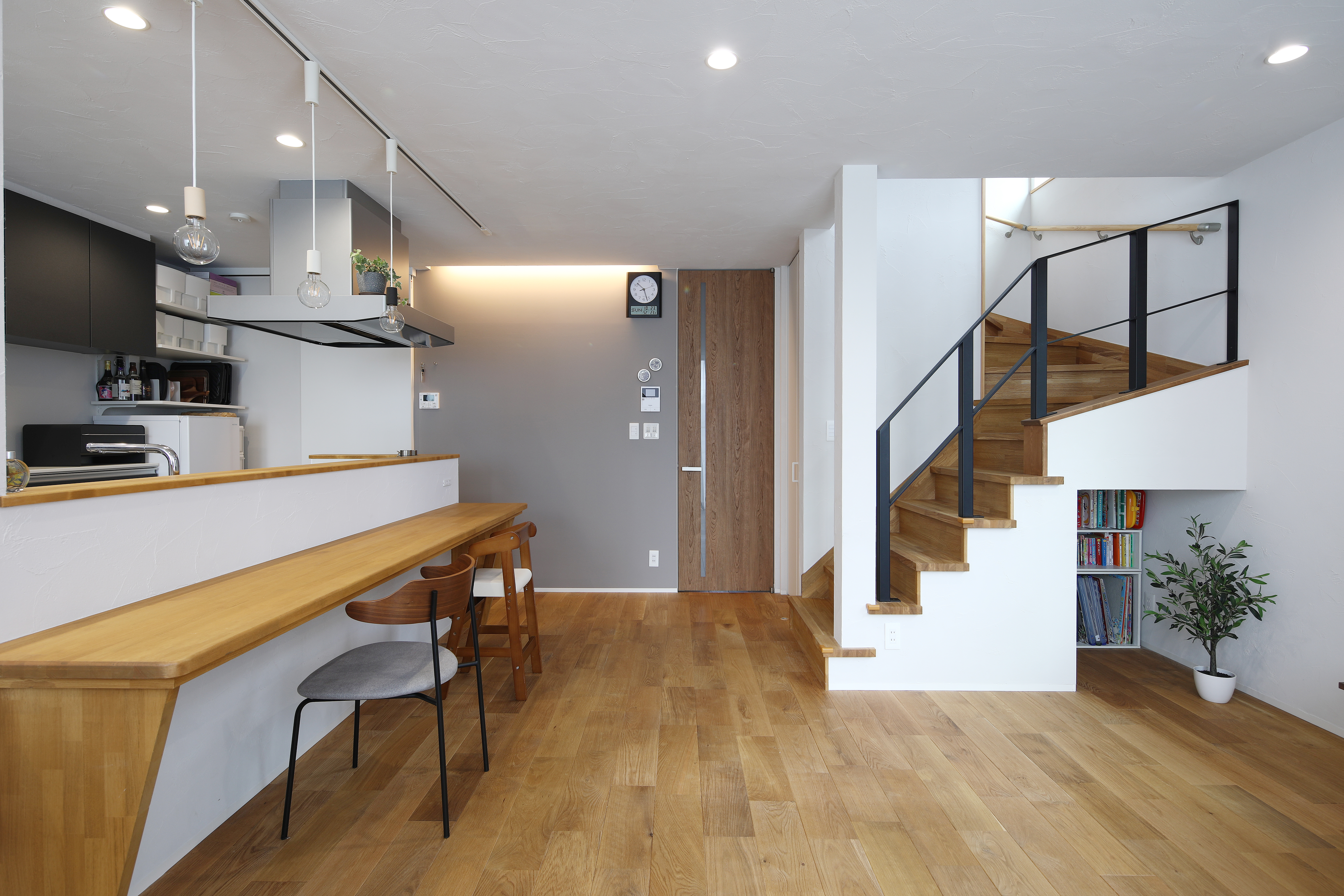 手すりを壁でふさがない設計にすることで、階段まわりはより明るく開放的に。さらに、ホコリが溜まりにくく掃除がしやすいのも嬉しいポイント。視線が抜けることで圧迫感が軽減され、お子さまが階段を使う様子も自然と見守ることができます。