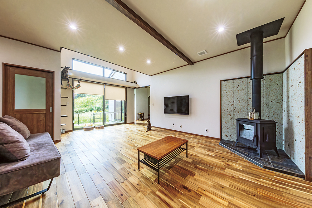 大きな開口部からたっぷり日差しが入るリビング。テラス窓を開けると中庭がある。珪藻土の塗り壁に、床は明るめの無垢材(アカシア)を選んだ。見晴らしも良く犬も猫も窓際スペースが大好き