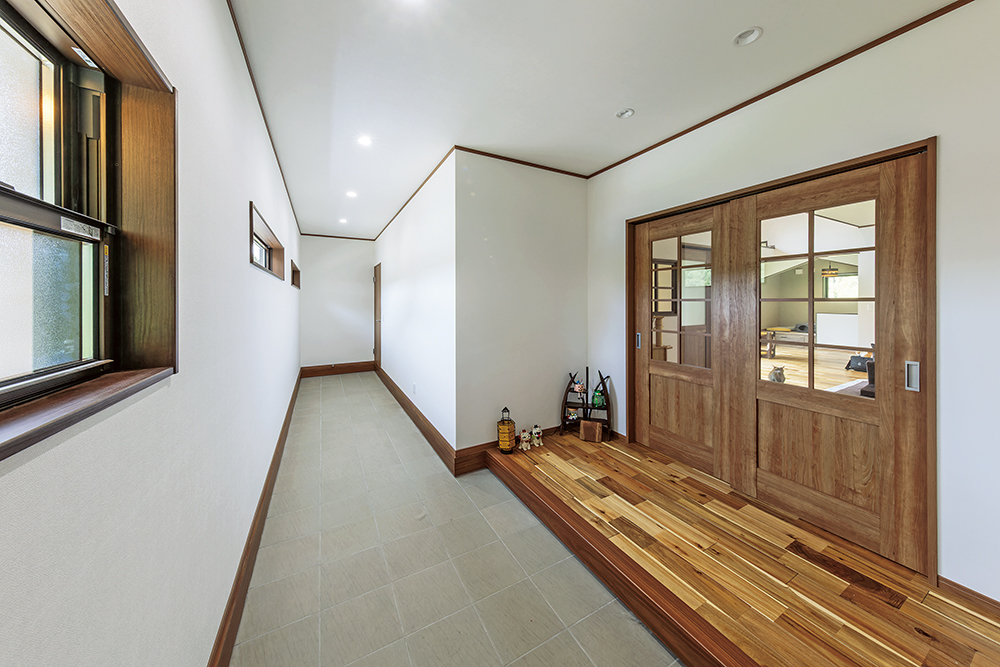 玄関ホールはリビングと同じ床材にすることでぬくもりと一体感を持たせた。汚れが気にならず掃除も楽な土間は、全長9mの両端に出入り口がある。犬の散歩の準備の他、ペットの様々な世話をする際に便利