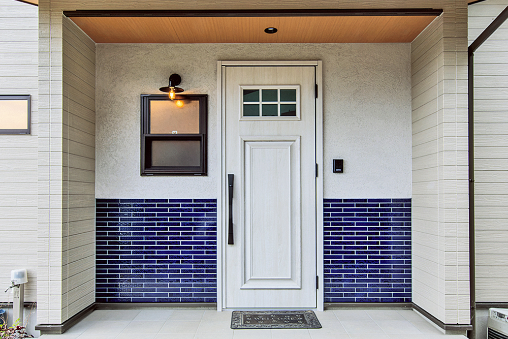 ラピスラズリ色のタイルと上げ下げ窓、塗り壁、白いドアを組み合わせた玄関。暖色系のブラケットライトが素敵な雰囲気