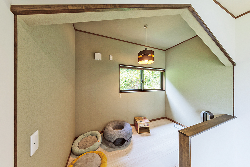 隠れ家を思わせる小上がりのあるヌック。小ぢんまりとした空間は、犬や猫にとっても癒やしのスペース。夜は、床下収納から布団を出して寝室として使用している