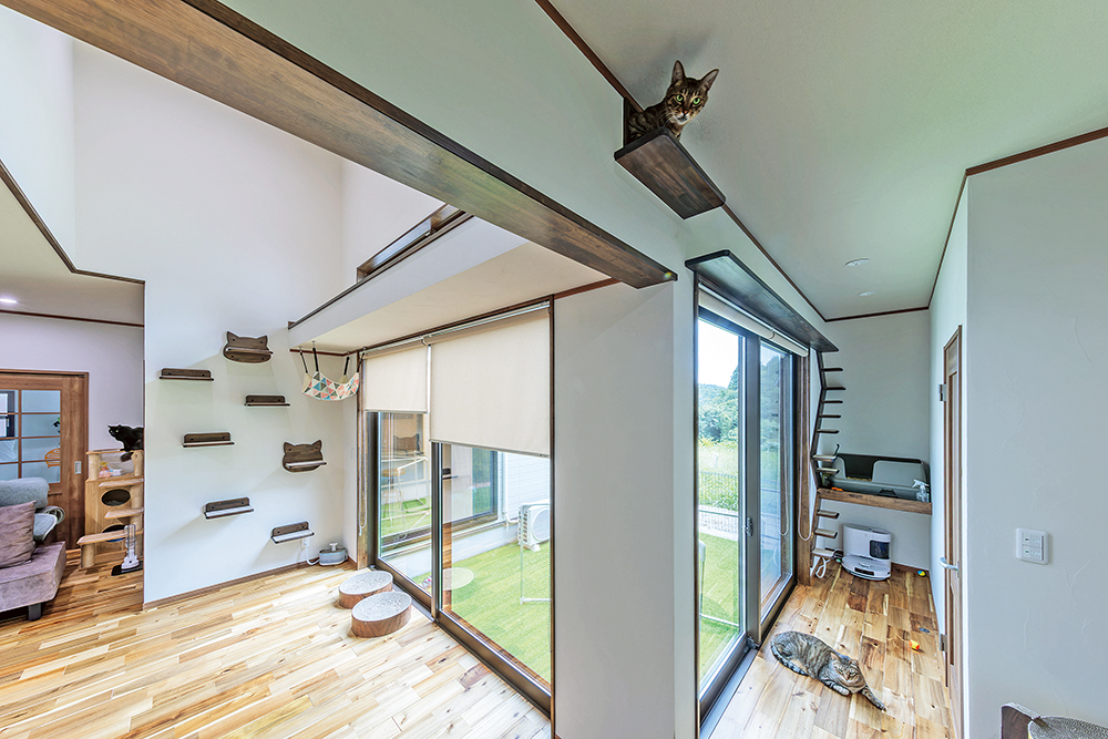 天井が高く開放感にあふれる窓際。大活躍のキャットステップとキャットウォークは、大工さんの手作り。右手奥に猫用トイレがある