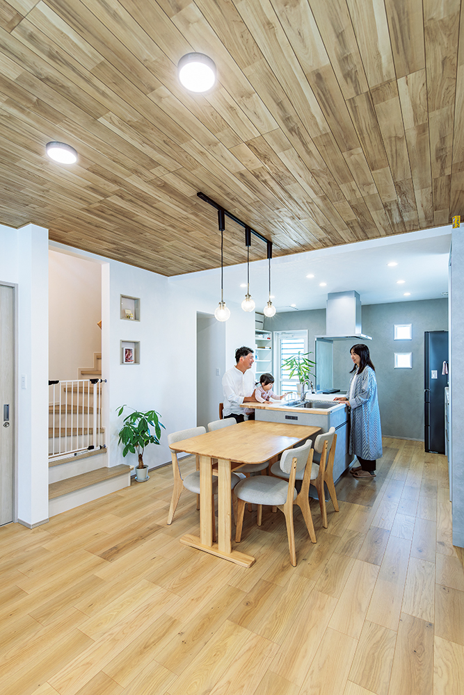 玄関ホールからリビングに入ると、キッチンまでひと続きの大空間が広がる。ダイニングテーブルを照らすペンダントライトなどは、奥様がインスタグラムから好みのデザインを探して手配してもらった。成長していく子どもとのコミュニケーションを意識したリビング階段は、セミクローズのさりげない仕上がりに。今はまだお子さんが小さいので、取り外し可能なゲートを設置し安全性を確保している。リビング部分の天井を木質素材にしたのは同社からの提案によるもので、開放感を保ちながら視覚的にゾーニングすることで、落ち着いた印象の空間ができた。
