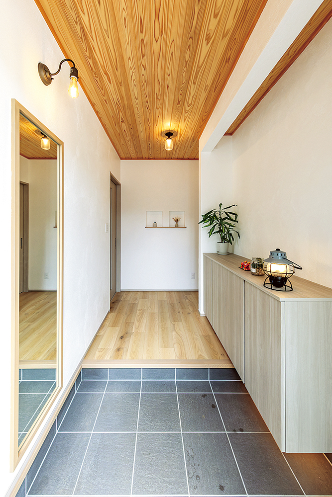 家の顔でもある玄関は、消臭と調湿効果がある漆喰壁を採用した。全身が映る姿見鏡の効果もあって実際より広々と見える