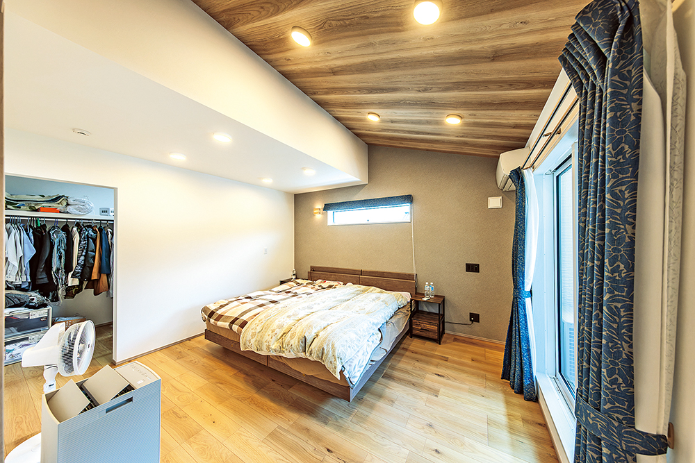 勾配天井に木材を使い個性的に仕上げた寝室。東側の高窓から朝日が差し込み目覚めが良い。仕切りの奥にはウォークインクローゼットがある