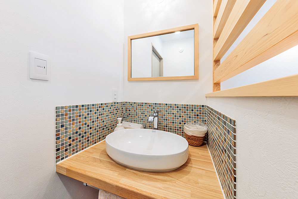 2階の小さな洗面所はタイル張りでかわいらしく仕上げた。寝る前の歯磨きや加湿器の給水など使い勝手が良い