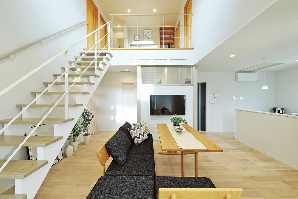 「こづちのいえ 創」のLDK。白を基調とした美しい内装に、大きな窓から差し込む自然光と無垢材の床が圧倒的な開放感を演出する、吹き抜けリビング。隣には寝室を配し、将来を見据えた間取りを提案