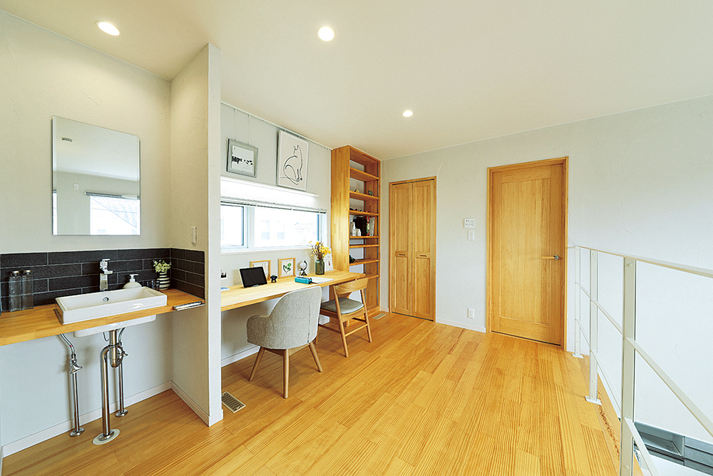 「創」の2階ホール。子ども部屋2室の中間に位置し、スタディコーナーとしても活用できるカウンターを造作。各階に洗面台も完備