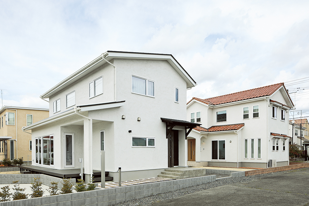 ゼロエネルギーを実現するZEH対応住宅「こづちのいえ 創」(左)。真っ白いシラス壁が上質な佇まいを醸し出す「こづちのいえ SUN」(右)。それぞれの魅力に触れながら理想の暮らしをイメージできる