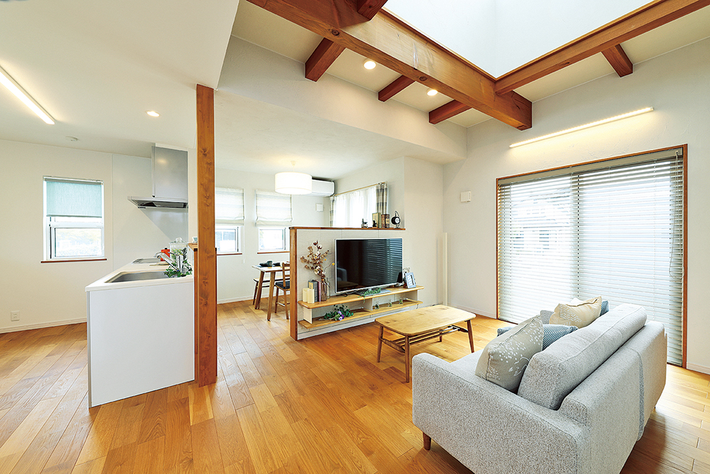 「こづちのいえ SUN」のLDK。現しの梁が木のぬくもりを添えるリビングから緩やかにつながるダイニングとキッチン。程良い距離感が心地良い。家族揃って食事を楽しむ時間やお客様を迎える開放的な空間など、シーンによって使い分けるのも楽しい