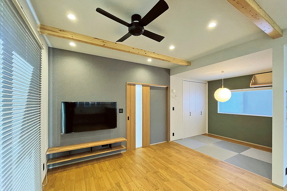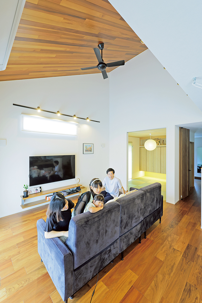 家族が集うリビングは勾配天井を生かした開放感あふれる空間に。床に合わせた木目の天井が温もりを添え、居心地の良さを演出している。隣には個室にもなる和室を配し、来客時など多用途に楽しめる