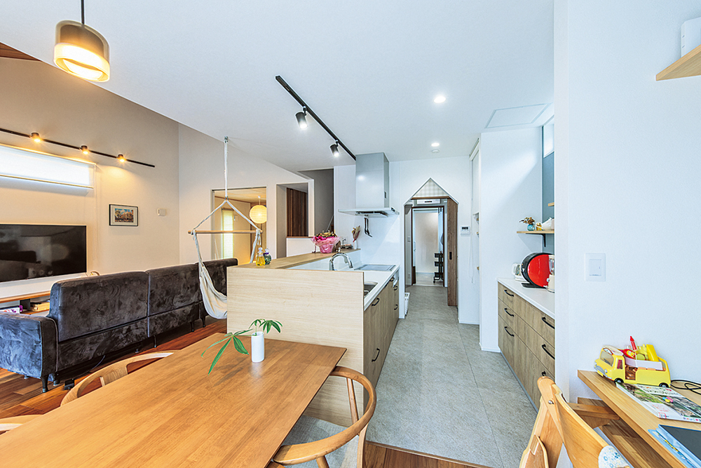 全体を見渡せるキッチンとダイニングテーブルを横並びにし、パントリー、ファミリークローゼットへ続く快適な家事動線を実現。LDKの中心に設けたブランコもお気に入り