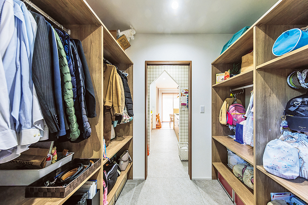 奥様がこだわったファミリークローゼット。家族4人分のロッカーを作り、帰宅後はランドセルなどを定位置に。アウターや着替えも収納し、すっきりと片付く