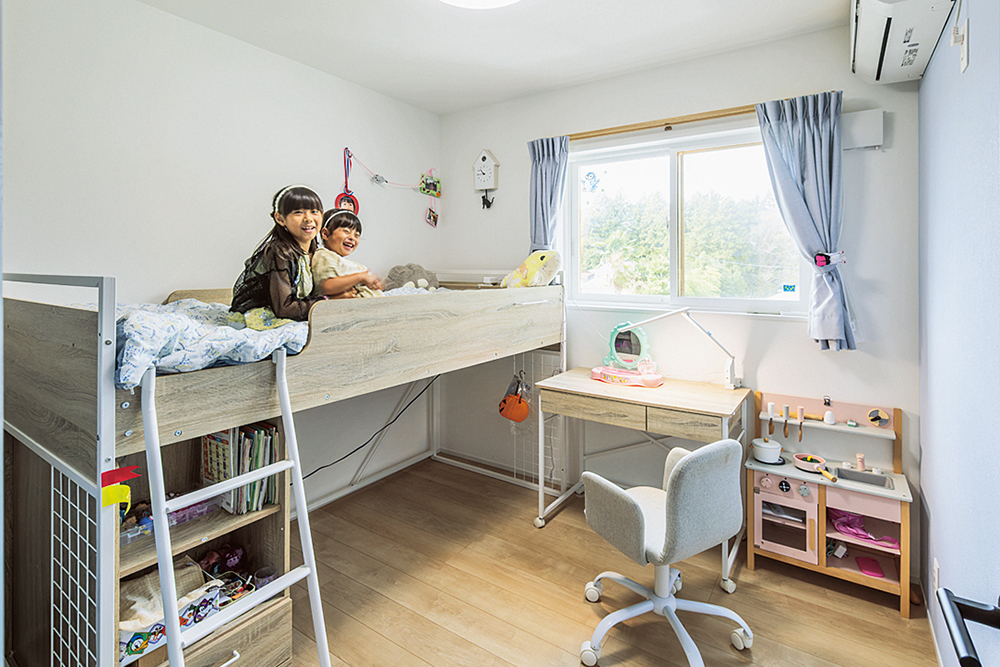 2階に子ども室を2室配置。部屋ごとにドアや壁の一面の色を変えて個性を演出。採光にも配慮した明るく伸びやかな空間で、かわいい姉妹は健やかな日常を満喫している