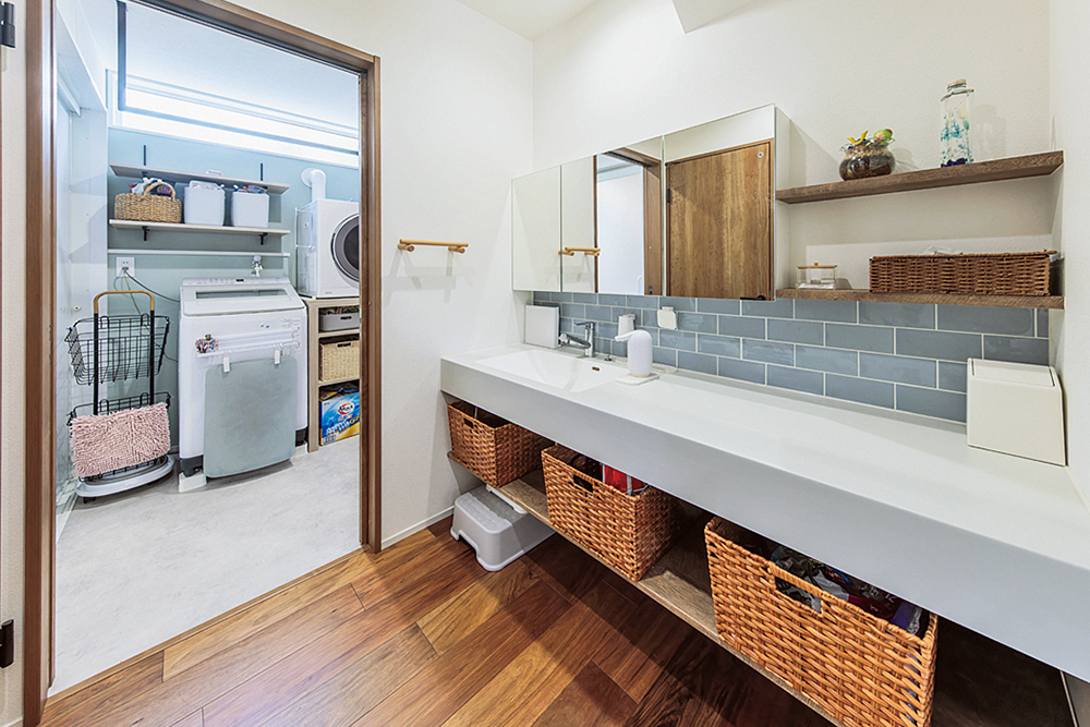 帰宅後すぐに使えるように玄関近くに設けた洗面室。並んで身支度ができる広さもゆとりをもたらした。隣には脱衣室兼ランドリールームを配し、回遊動線でLDKへつながる