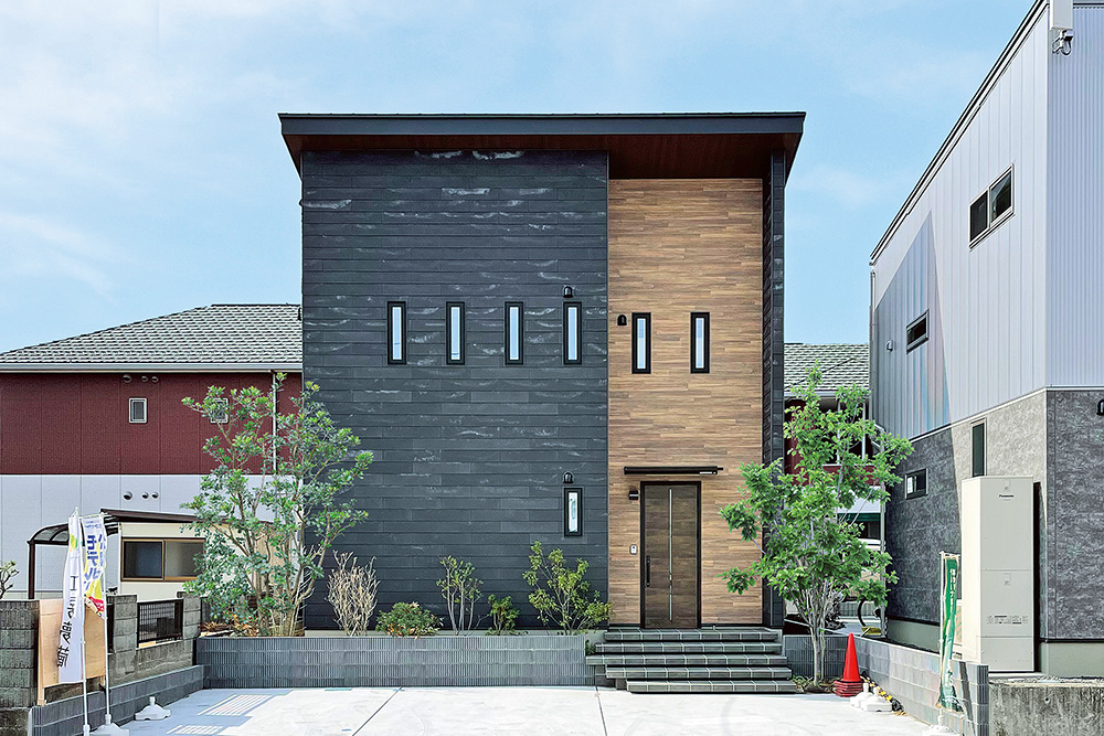 勾配が際立つ大屋根がインパクトのあるモダンな外観。太陽光発電パネルを12kW搭載し、光熱費の軽減も実現。外壁はつなぎ目が目立たないデザインを選び、縦格子がアクセントに