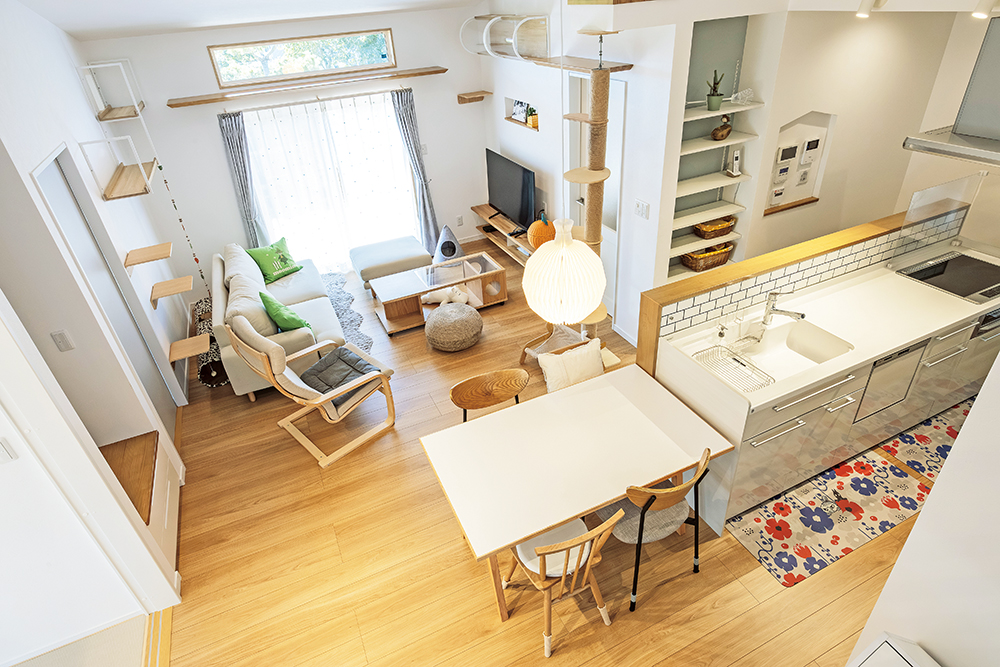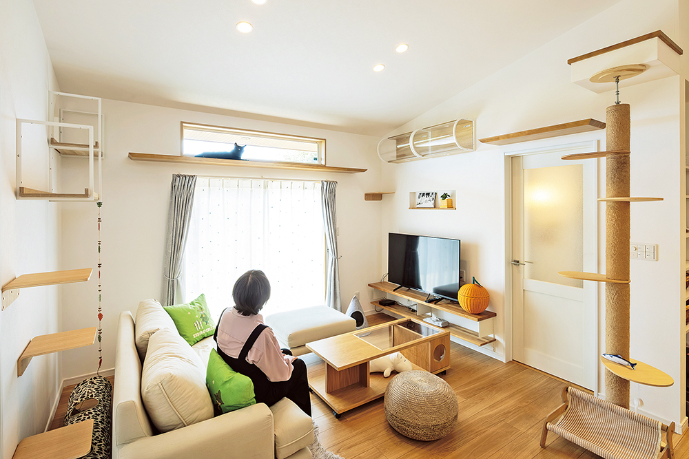 リビングにはキャットウォークをインテリアのようにレイアウト。キャットポールの上を猫達が乗りやすい棚状にするなど担当者の心配りが光る
