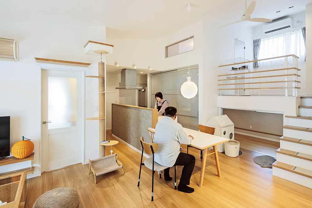 秀逸なのは平屋なのに縦横に広がりを感じる空間構成だ。LDKの北側ロフトに個室を2つ、その下に広い「おもしろ収納BOX」を取ることで平屋に3層のフロアが出現。そこに変化に富んだキャットウォークや単独の寝床など、愛猫が喜ぶ工夫をしっかりプラス。さらに移動が楽な回遊動線、使い勝手を重視した収納、玄関洗面台など今も将来も暮らしやすいよう考え抜いた要素が家中に具現化されている。