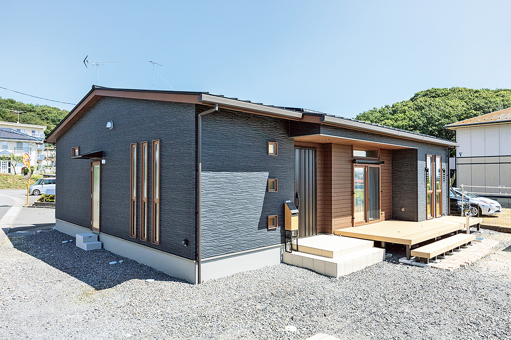 凹凸のある外壁はダークカラーに、サッシ枠と軒天はこだわって木目柄に、そして三連の窓をアクセントに。上品な印象の外観も理想通り。広いウッドデッキを含め、外構をどうするかはこれからの楽しみに