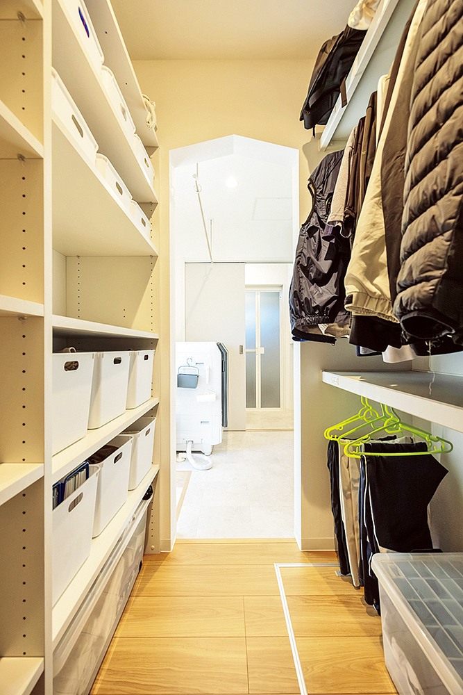 玄関と直結するクローゼットを通って洗濯室、浴室へ直行できる動線は同社が提案。外での汚れや埃をリビングに持ち込まずに済むと奥様に大好評