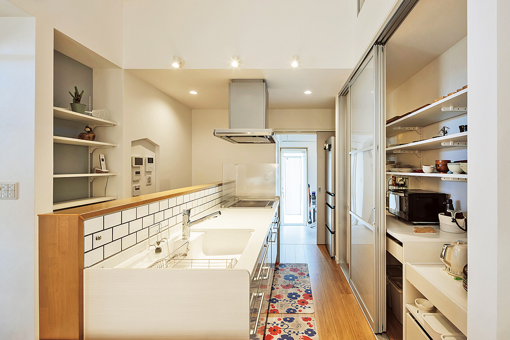 周遊式のアイランドキッチン。ランドリールームまで一列に配し家事動線に優れる。キッチン後ろの収納棚は扉で完全に閉じることも
