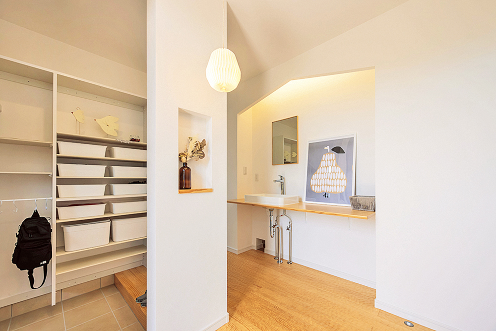 帰宅後は即手洗いをと、奥様の発想で洗面台を玄関に設置。三角の下がり壁や広いカウンターを美しく造り込み「映える空間」に。ご主人が惚れ込んだスプーン加工を施したパイン無垢の床も表情豊か。洗面台下には猫穴が